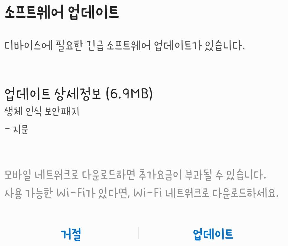 긴급 소프트웨어 업데이트라고 해서 들어가보니 생체 인식 보안 패치 - 지문 이라고 뜨네요.