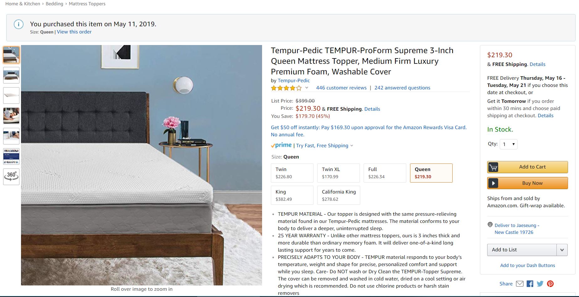 물론 $200 넘어서 관세랑 부가세를 내야 하지만, 템퍼는 Made in USA라 FTA 때문에 부가세만 내면 됩니다.